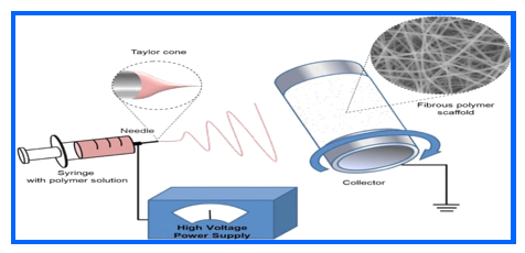 Nanofibers are generated by introducing a liquid polymer blend to form high electric field with the use of a capillary or tube syringe needle. When the electrostatic forces surpass the surface tension of the liquid, a Taylor cone is formed, propelling the thin jet rapidly towards various collecting plates. Instabilities in the jet cause a whipping motion that elongates and narrows the jet, allowing for the evaporation of some solvent or cooling of the melt, resulting in the deposition of nanofibers on the collecting plates. Consequently, this process yields random non-woven films, electrospun nanofibers, and uniaxially aligned sheets [149].