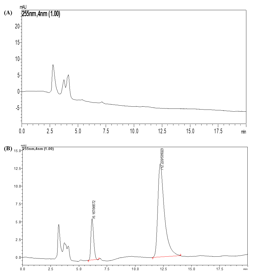 Fig. 2: Pictorial representation showed the chromatogram of (A) Blank plasma, (B) imatinib (RT 12.22 min) and internal standard (Dasatinib) (RT 6.16 min)