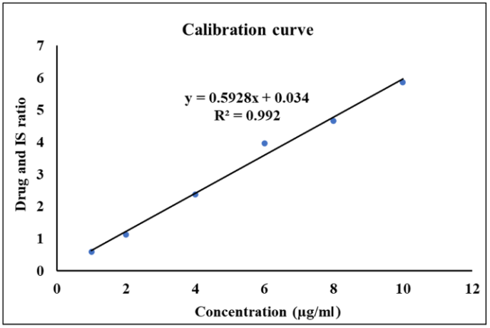 The calibration curve was plotted between the range of 100 to 10,000 ng/ml; the Regression Coefficient (R2) was not less than 0.99, which shows the strong correlation between the area of drug and IS. The approach is suitable for the tested range, as evidenced by the accuracy of the back-calculated concentrations of the calibration standards, which were within ±15% of their nominal concentrations at every level.
