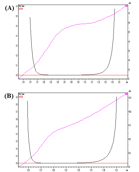 Fig. 4: The pictorial representation showed the peak purity of the drugs (A) imatinib (B) IS