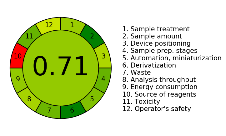 Pena Pereira F, Wojnowski W, Tobiszewski M. AGREE analytical GREEnness metric approach and software. Anal Chem. 2020;92(14):10076-82. doi: 10.1021/acs.analchem.0c01887, PMID 32538619.