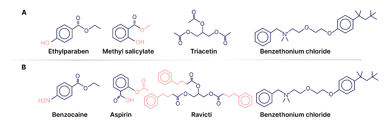 The motivation for testing the biological activities of excipients may be the similarity of the structures of some APIs and excipients. This can be seen in fig. 1, where the first row shows the formulas of commonly used excipients, and the second row shows the formulas of approved APIs. Some excipients are also active substances, such as the antiseptic benzethonium chloride.
