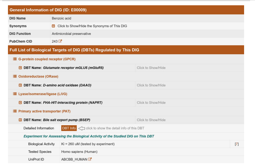 The top of the table provides general information about benzoic acid, while the complete list of Biological Targets (DBT) regulated by it is shown below. All biological targets are classified according to their biochemical families. Data on the biological activity of excipients (highlighted in color) and a hyperlink to additional information in other available databases are provided below the text. By clicking the "DBT Information" button, you will be redirected to a new page containing data on synonyms of the excipient, biochemical family, tested organism, gene name, and more [50]. This format is used for information on APIs and drugs.