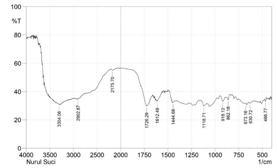 The FTIR study findings are shown in fig. 2. Wave number 3304 cm−1 represents the stretching frequency of the −OH functional group, while 2902 cm−1 represents the −C−H functional group. The −C=O functional group has a stretching frequency of 1726 cm−1, the C-O (carbonyl) functional group has 1612 cm−1, and the −C− O−C functional group has 1341 cm−1.