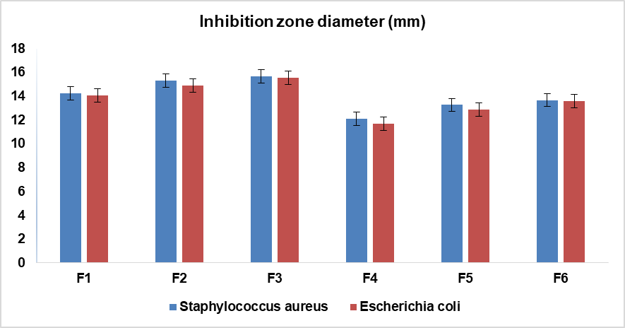 Regarding variability, the inhibition zone's SD was relatively small (±0.3 mm for both bacteria), indicating good consistency in the results. However, minor variability could be attributed to differences in the uniformity of bacterial inoculum on the agar plates and the precise placement of the paper discs. All tests were performed in triplicate to minimise such errors, and careful attention was given to standardizing the experimental conditions.