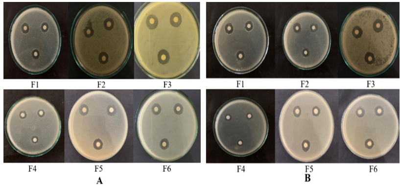 Fig. 5: Test result for antibacterial activity of Phyllanthus emblica fruit nanosimplicia suspension against Staphylococcus aureus (A) and Escherichia coli (B) bacteria