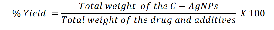 Following a 2 ml ethanol dilution, pure CuR, AgNPs, and C-AgNPs equivalent to the weight of CuR were sonicated. Double-distilled water was used for further dilutions, and UV absorbance was recorded. A standard calibration curve at a wavelength of 423 nm was used to quantify the drug content, and the material balance was computed in relation to that content [15]. The following formula was used to calculate the yield percentage based on the initial amount.