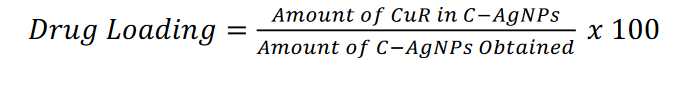 The freeze-dried C-AgNPs were dissolved in 0.5 ml of ethanol and an appropriate quantity of distilled water for dilution. The solution was then filtered through a 0.45 µm membrane filter, and the concentration was measured at 423 nm using a UV-Vis spectrophotometer [15]. The following equation was used to quantify the drug loading (DL) capacity from C-AgNPs.