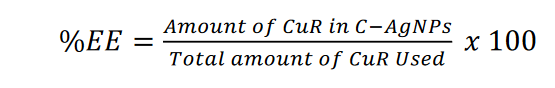 The CuR % encapsulation efficiency (%EE) in C-AgNPs was determined based on the supernatant collected during the nanoparticle formulation. The clear supernatant was obtained after centrifugation at 6000 rpm for 15 min and analyzed using UV-visible spectroscopy at 423 nm. The following equation (3) was used to calculate the drug %EE [16].