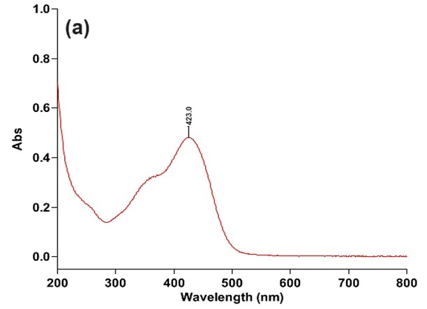 The C-AgNPs exhibited ideal drug loading (>60%). However, to increase drug loading, other factors such as reaction time, temperature, and the drug-to-Ag precursor ratio may need to be further considered and optimized. The percentages of encapsulation efficiency (EE) and drug loading (DL) of C-AgNPs varied from 58.56±4.18% to 74.24±5.87% and from 89.23±6.14% to 95.99±7.81% (fig. 2). Approximately 90% of the total output was due to the highest absorption of C-AgNPs, which occurred between 200 and 400 nm, with a peak observed at 423 nm (p>0.05). This measurement indicates that the EE was between 95% and 105% of CuR, which is the reference (label amount) range [19]. Due to its smaller size and maximum DL (95.99±7.81%) and EE (74.24±5.87%), CAgNP1 was chosen as the best formulation for this investigation. The lipophilic property of CuR (log P = 3.29) and the CuR: AgNO₃ ratio of C-AgNP1 were found to be 1:2. This suggests that incorporating a positively charged carrier, such as Ag⁺, could enhance EE [20].