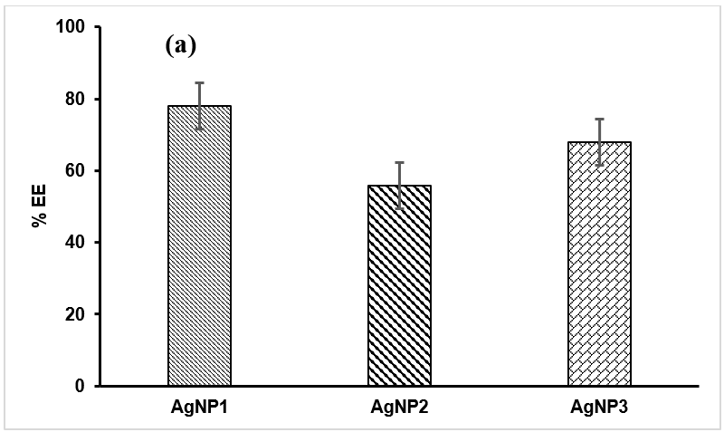 Fig. 2: (a) % EE and (b) % DL of prepared C-AgNPs. * Each value signifies mean±SD, n = 3