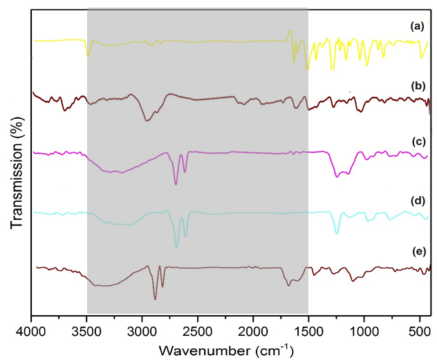 Fig. 3: FTIR spectrum of (a) Pure CuR, (b) AgNO3, (c) AS extract, (d) AgNPs, and (e) C-AgNP1 were obserbed at 1500 – 3500 cm–1