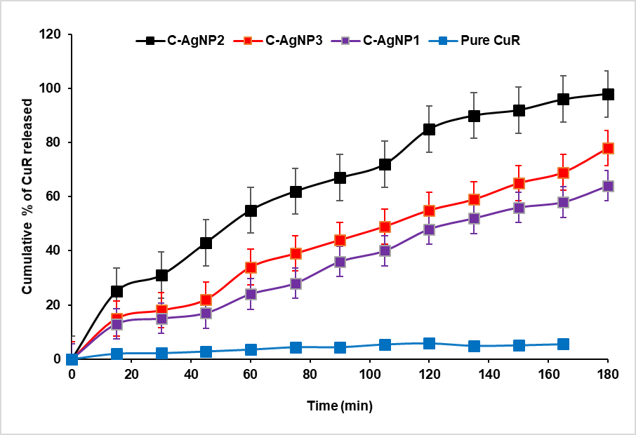 Fig. 4 displays the cumulative CuR release profiles from C-AgNPs. As a control, pure CuR in 1X PBS was employed. For the in vitro release of CuR, a pH of 6.8 in PBS was selected, as it is similar to the physiological conditions of human tissues. The pH, which has been shown to be a crucial factor in many therapies, influences how the drug is released. Normal tissue has a different pH than disease-induced tissues and organs, depending on the pathological processes occurring in those tissues [23, 24]. Under the pH 6.8 condition, pure CuR release was sustained, and no early burst release was observed, suggesting a potentially advantageous use of the phytogenic C-AgNPs for topical and intravenous delivery.