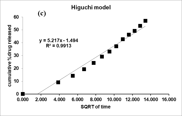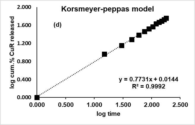 The Korsmeyer-peppas model (0.999±0.10) provided a better explanation for the in vitro release of CuR from C-AgNPs compared to the first-order (0.993±0.07) release kinetics, as displayed in table 3. The Korsmeyer-Peppas model is a mathematical equation used to describe drug release from polymeric matrices.