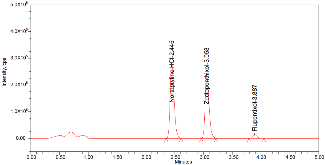 Results: The calibration curve was linear in the range of 5.0ng/ml to 200.0ng/ml (r2= 0.99988±0.006) for nortriptyline HCl and 0.25ng/ml to 10.0ng/ml (r2=0.99972±0.007) for flupentixol. Matrix effect, recovery and stability results were within the acceptable limit. An electrospray ionization source was used to study of nortriptyline HCl, flupentixol at m/z 300.8471 →73.2501, m/z 435.5225→103.4247 and m/z 400.9657→142.0087 for zuclopenthixol were ion pairs of mass analysis.