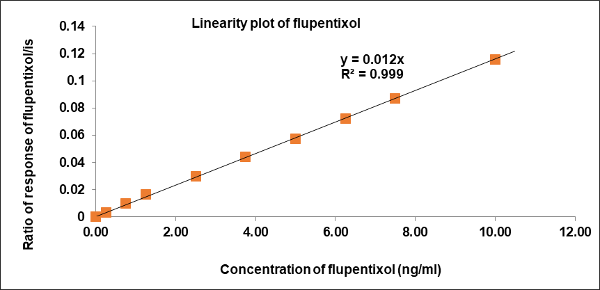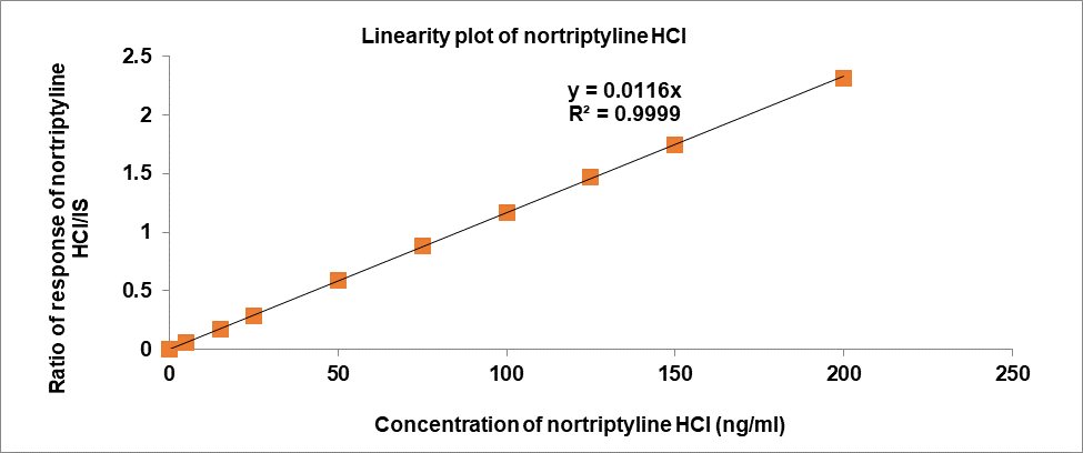 The peak area ratio of calibration standards was proportional to the concentration. The concentration range of nortriptyline HCl is 5-200 ng/ml and flupentixol is 0.25-10 ng/ml. Linearity results of nortriptyline HCl and flupentixol were shown in following table 1 and their calibration plots were shown in fig. 4 [52]. The calibration curves were appeared linear and coefficient of correlation was found to be 0.999 for nortriptyline HCl and flupentixol.