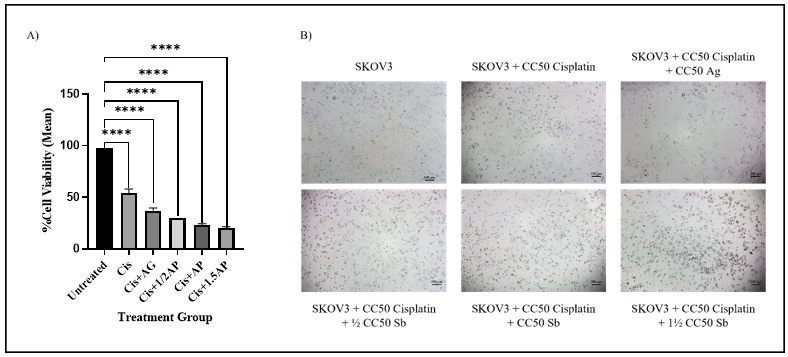 Results: Cisplatin reduces cell viability to 54%, 37% when combined with AG, and 30%, 23% and 20% with ½CC50 AP, CC50 AP and 1.5CC50 AP, respectively. AG and AP extract decreases SKOV3 cell viability in a dose-dependent manner. Cisplatin combined with AP showed a statistically significant increase in BAX, Caspase 3, Caspase 9 expression and a decrease in BCL2, which indicated synergy in apoptotic pathways. The best result was seen in cisplatin combined with ½CC50 AP. A decrease in Cyclin D and VEGF was seen in all groups, the best seen in ½CC50 AP and CC50 AP, respectively, showing optimal cell cycle arrest and anti-angiogenesis properties when cisplatin is combined with AP extract.