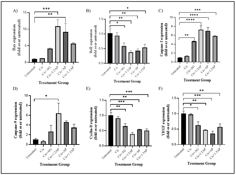 Fig. 2: Effects of AG and AP extracts in various experiment groups to levels of A) Bax; B) Bcl-2; C) Caspase-3; D) Caspase-9; E)Cyclin D; F) VEGF. n=9, After incubating the cells for 24 h, they were cultured, and RNA isolation was performed to analyze their gene expression using qRT-PCR. The data were presented as mean±SD for all parameters except for caspase-9, which was presented as median and interquartile range (IQR).*p<0.05, **p<0.01, ***p<0.001, ****p<0.0001 compared with the control