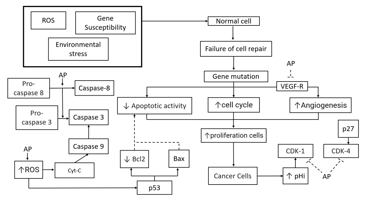 In summary, our research revealed that a combination of cisplatin and AG or AP extract can promote apoptosis, anti-angiogenesis activity and cycle cell arrest but those properties were better shown in the AP extract group combination. The proposed mechanism of AP extract on SKOV3 cells is illustrated in fig. 3. The best group that showed the highest level of apoptosis and cell cycle arrest was demonstrated in a group containing CC50 Cisplatin and ½ CC50 AP, while the highest level of anti-angiogenesis properties was seen in group CC50 Cisplatin and CC50 AP extract. Therefore, we can derive two conclusions. First, is that combining cisplatin with AP extract was better than cisplatin and AG in inducing cell cycle arrest, apoptosis, and anti-angiogenesis properties. Second, the combination of cisplatin with AP or AG provides a synergistic effect that enhances the anticancer properties of chemotherapy which might prove beneficial to investigate further for its implications in clinical settings.