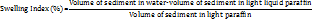 A specified quantity of SSS was taken into two graded test tubes. One was added with light paraffin, and the second one was added with distilled water. These dispersions were sediment for 12 h, and SI was calculated using the formula below.