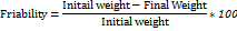 Friability is the parameter that will explain how the tablet withholds its shape and morphology. As per the standard procedure, "Roche friabilator" was used here. As per the guidance, ten tablets or 6.5 g (whichever is close) weight of tablets should be subjected to friability testing. In this study, about 6.5 g (approx. 66 tablets) of tablets were taken into consideration. These tablets were loaded into the friability and subjected to 100 rotations (25 RPM for 4 min), and the pills/tablets were collected after being weighed and de-dusted in the friability [17]. The % difference in the weight to that of the initial weight is the friability. Friability is calculated using the formula below.