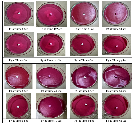 To determine the tablet WT, we used the Petri dish method. The Whatman filter paper was cut into the petri dish size. In a plain petri dish, 2 mm water was poured, and a die soluble in water was included in it. Then, a filter paper was placed to wet it completely. The tablet/pill was positioned on the wetted filtration material, and time was counted till the tablet/pill got fully wet [19].
