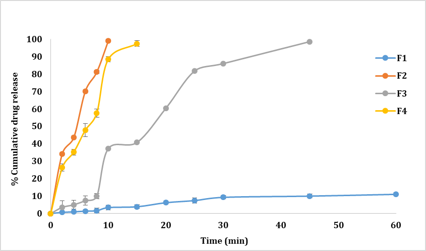 Fig. 5: C-FDTs dissolution profiles (F1 – F4). Data are given as mean±SD, n=3. Error bars indicate SD values