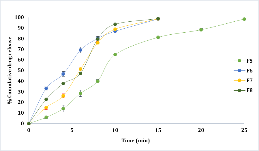 Fig. 6: C-FDTs dissolution profiles (F5 – F8). Data are given as mean±SD, n=3. Error bars indicate SD values