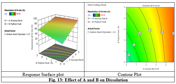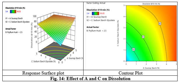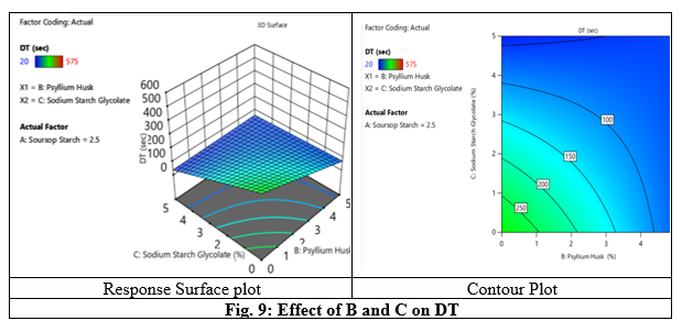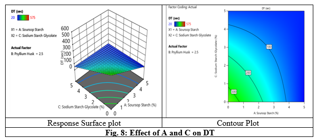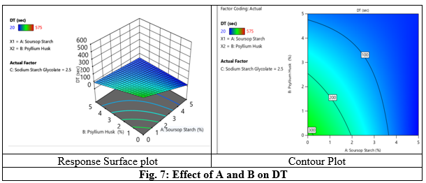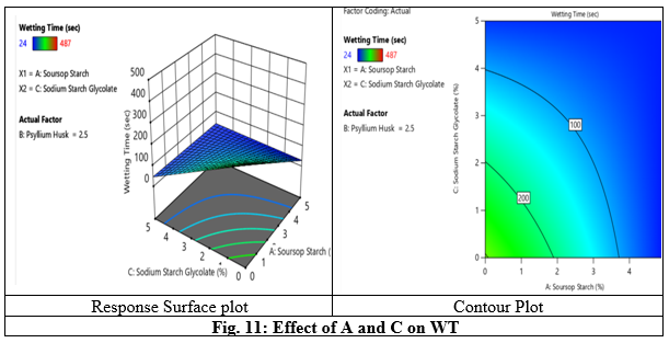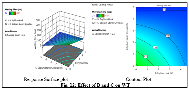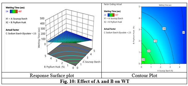 The factorial design employed here is 23 designs. The model was run with the measured values of WT, DT, PD10 and dissolution efficiency. Based on the experimental results, the model has given the interaction effect for each superdisintegrant and also for the combination of disintegrants. The positive and negative impact indicates how the CQA is moving with the individual and combination inputs of independent variables. Using Design Expert 7.11 software, surface response curves and contour plots were created after the equation was generated. The effect of independent superdisintegrants SSS (A), psyllium husk (B), and SSG (C) is shown in table 7.