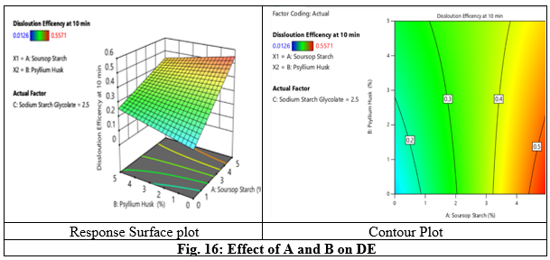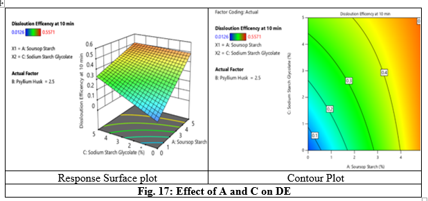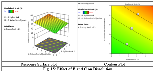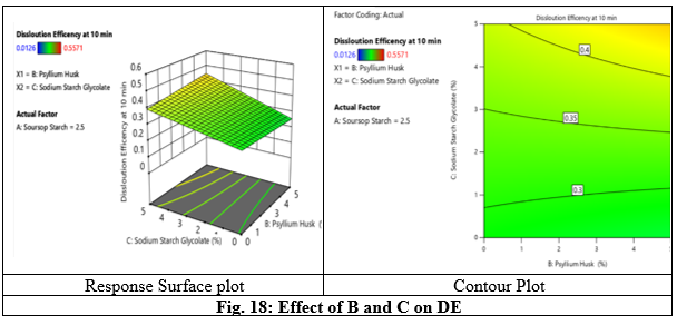 The results of SSS (A), psyllium husk (B), and SSG (C), along with their interaction with PD10 and dissolution efficiency at 10 min, were tabulated in table 7. The interaction of A and B on dissolution and dissolution efficiency are depicted in fig. 13 and fig. 16. Fig. 14 and fig. 17 illustrate how A and C affect dissolution and dissolution efficiency. The interaction of B and C on dissolution and dissolution efficiency were depicted in fig. 15 and 18. The contour plots were linear. It demonstrates that when the concentrations of SSS (A), psyllium husk (B), and SSG (C) rise, they correspondingly increase the PD10 and dissolution efficiency at 10 min of FDTs.
