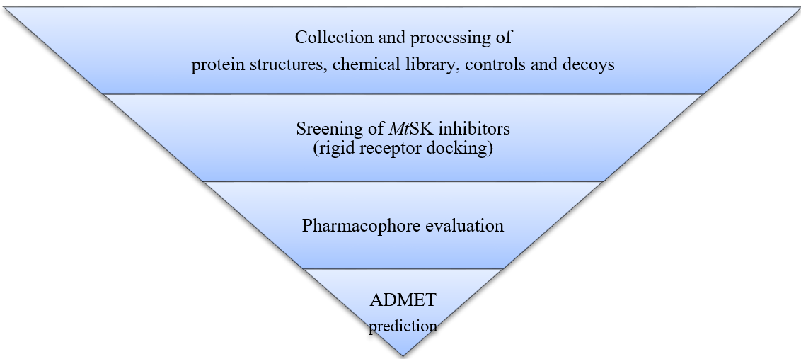 The study's methodology includes the collection and processing of protein structures and chemical library, the identification of MtSK inhibitors by screening, the evaluation of pharmacophore, and the prediction of ADMET, as seen in fig. 1. The PC workstation used for this study was provided with the following system specifications include the Windows 11 Pro operating system, an Intel® Core™ i7-10700K 3.80GHz CPU, 64GB of RAM, and an NVIDIA® Quadro P1000 graphics card.