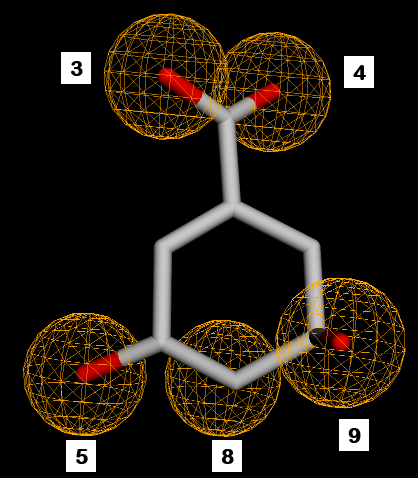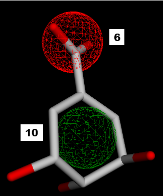Fig. 2: SKM pharmacophore features. 1,2,7=hydrogen donor. 3,4,5,8,9=hydrogen acceptor. 6=negative ion. 10=hydrophobic