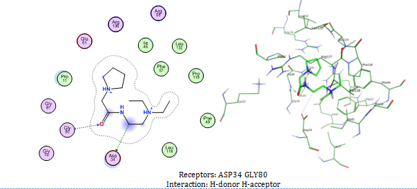 The pharmacophore of compound 1, which acts as a hydrogen donor via its nitrogen moiety (), demonstrates the role of its pyrrolidin nitrogen in the docking interaction with ASP34. The pharmacophore evaluation did not support the compound's docking interaction with Gly80, which had a carbonyl group as a hydrogen receptor.