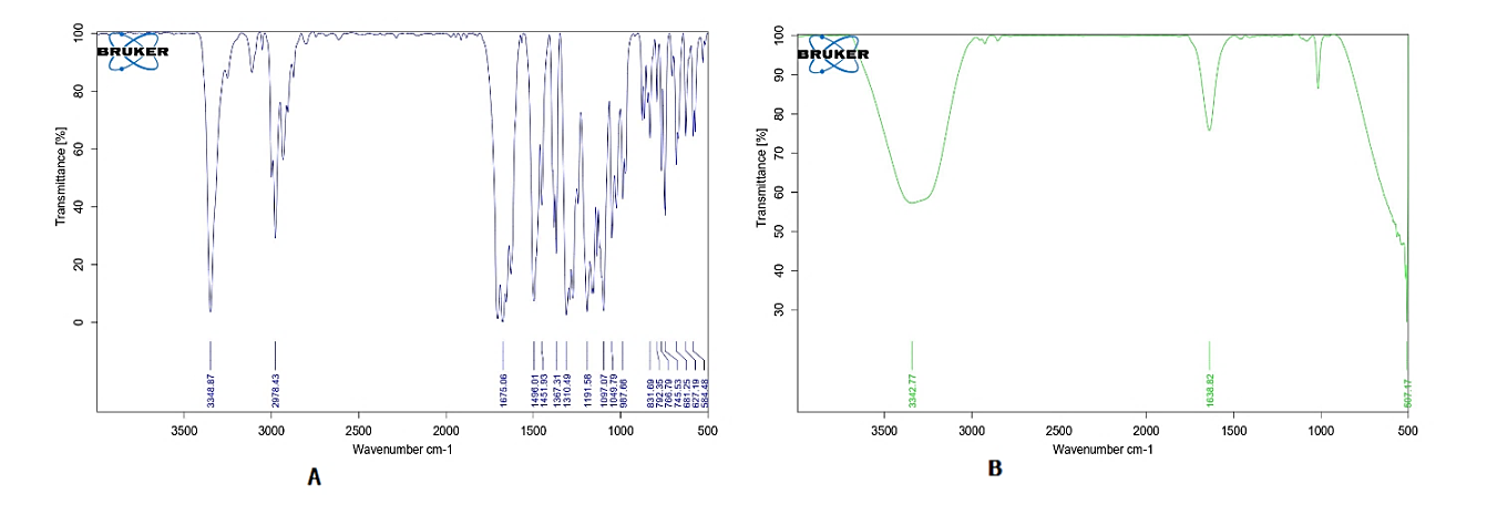 FTIR spectroscopy (Bruker FT-IR Tensor 27) is used for the characterization of lacidipine pure drug and optimized formulation. The spectrum of the pure drug was obtained by the KBr disc method and optimized formulation by the Attenuated total reflectance (ATR) method. The spectra were acquired in a frequency range of 4000-400 cm-1. The resulting spectra were compared and analyzed to identify the peaks corresponding to the functional groups [18, 25].