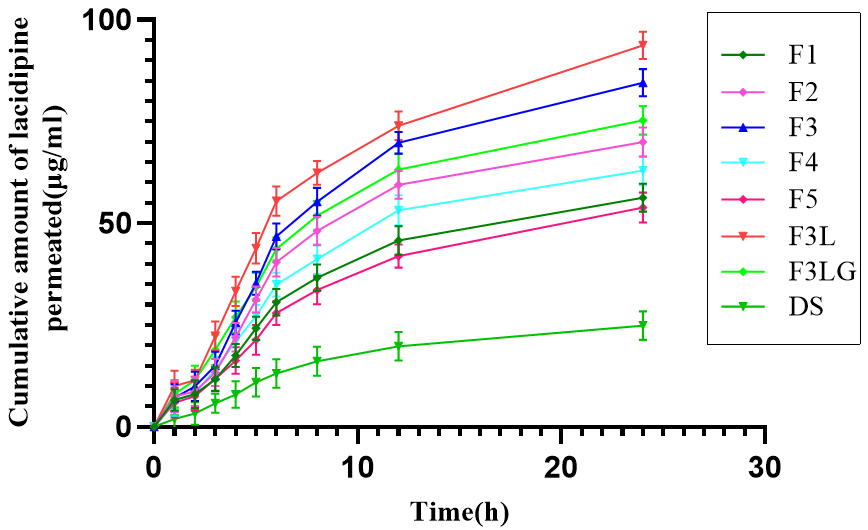 Note: Graph represents the cumulative amount of drug permeated through rat epidermal layer at different time points. DS: Drug suspension; F1, F2, F3, F4 and F5: Transferosomal formulations; F3L: optimized transferosomal formulation; F3LG: transferosomal gel
