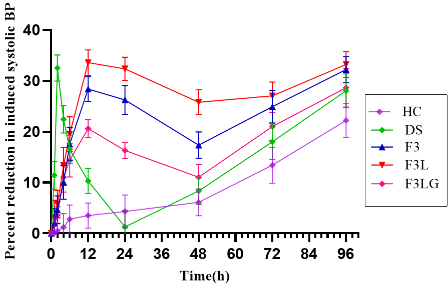 Note: Graph represents the percent reduction in systolic BP with time in groups treated with DS: Drug suspension; F3: Transferosomal formulation; (F3L): Optimized transferosomal formulation; F3LG: transferosomal gel; HC: Hypertensive positive control