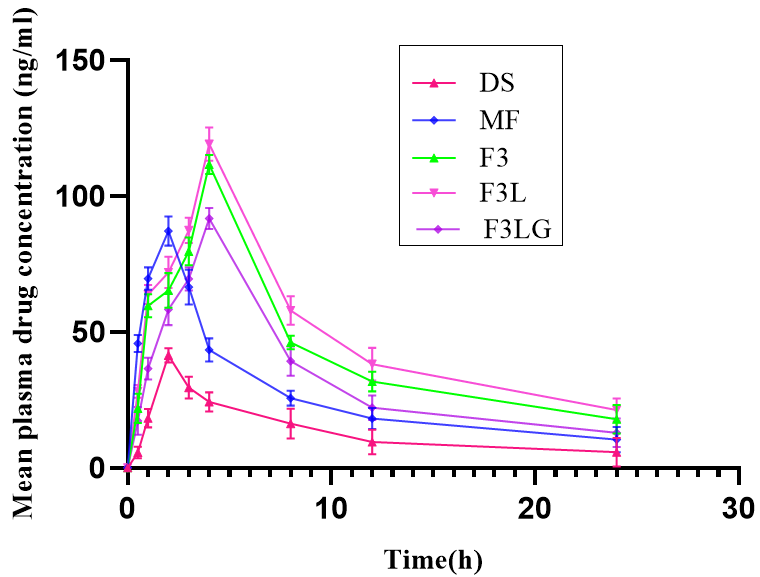 Note: Graph represents the mean plasma drug concentration (ng/ml) with time after treatment with DS: Drug suspension; MF: Marketed formulation; F3: Transferosomal formulation; F3L: Optimized transferosomal formulation; F3LG: transferosomal gel