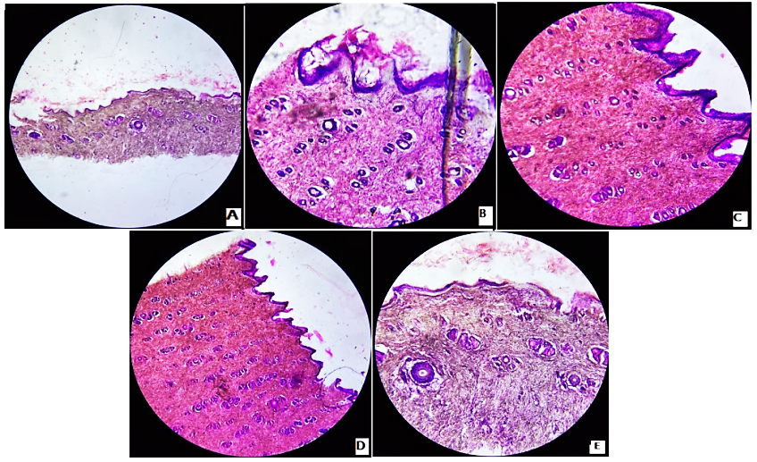 Note: Photomicrographs showing the histopathological alterations in the stratum corneum layer after treatment. (A) untreated (B) treated with sodium lauryl sulphate (C) treated with transferosomal formulation (F3) (D) treated with optimized transferosomal formulation (F3L) (E) treated with transferosomal gel (F3LG)