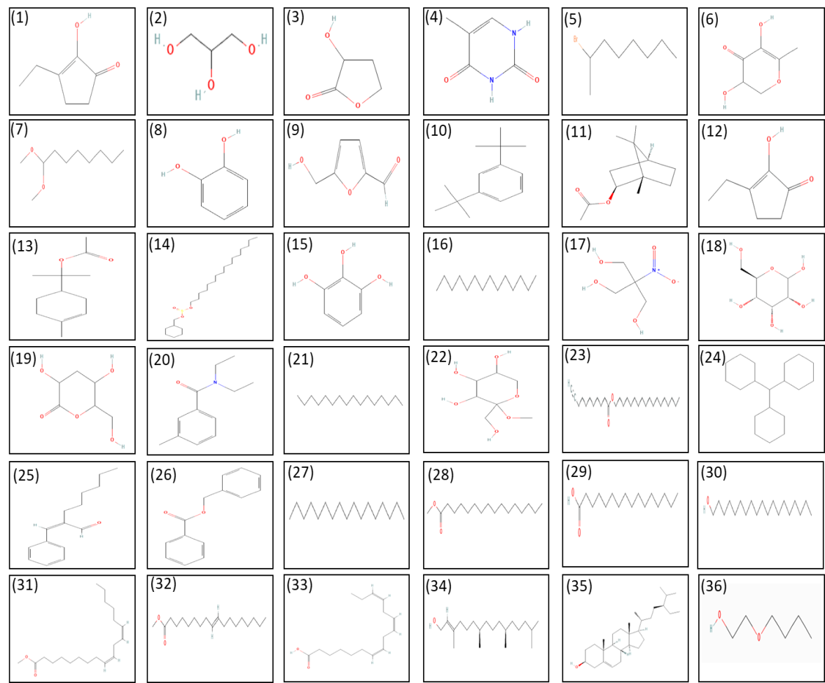 Fig. 1: 2D structures of the compounds from nanoherbal senduduk bulu (1) 2-Cyclopenten-1-one, 2-hydroxy-; (2) Glycerin; (3) 2-Hydroxy-gamma-butyrolactone; (4) Thymine; (5) Octane, 2-bromo-; (6) 4H-Pyran-4-one, 2,3-dihydro-3,5-dihydroxy-6-methyl-; (7) Octanal dimethyl acetal; (8) Catechol; (9) 5-Hydroxymethylfurfural; (10) Benzene, 1,3-bis(1,1-dimethylethyl)-; (11) Isobornyl acetate; (12) 2-Cyclopenten-1-one, 3-ethyl-2-hydroxy-; (13) α-Terpinyl acetate; (14) Sulfurous acid, cyclohexylmethyl hexadecyl ester; (15) 1,2,3-Benzenetriol; (16) Tetradecane; (17) 1,3-Propanediol, 2-(hydroxymethyl)-2-nitro-; (18) D-Allose; (19) 3-Deoxy-d-mannoic lactone; (20) Diethyltoluamide; (21) Hexadecane; (21) α-Methyl-l-sorboside; (22) Undec-10-ynoic acid, octadecyl ester; (23) Methane, tricyclohexyl-; (24) Octanal, 2-(phenylmethylene)-; (25) Benzyl Benzoate; (26) Heptadecane; (27) Hexadecanoic acid, methyl ester; (29) n-Hexadecanoic acid; (30) n-Nonadecanol-1; (31) 9,12-Octadecadienoic acid (Z,Z)-, methyl ester; (32) 9-Octadecenoic αSitosterol; (36) Ethanol, 2-butoxy