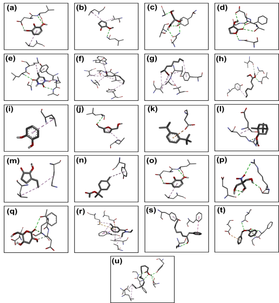 Fig. 3: Visualization 3D of interactions borussertib and bioactive compounds from nanoherbal senduduk bulu against the AKT1 protein. (a) borussertib; (b) 2-Cyclopenten-1-one, 2-hydroxy-; (c) Glycerin; (d) 2-Hydroxy-gamma-butyrolactone; (e) Thymine; (f) Octane, 2-bromo-; (g) 4H-Pyran-4-one, 2,3-dihydro-3,5-dihydroxy-6-methyl-; (h) Octanal dimethyl acetal; (i) Catechol; (j) 5-Hydroxymethylfurfural; (k) Benzene, 1,3-bis(1,1-dimethylethyl)-; (l) Isobornyl acetate; (m) 2-Cyclopenten-1-one, 3-ethyl-2-hydroxy-; (n) α-Terpinyl acetate; (o) 1,2,3-Benzenetriol; (p) 1,3-Propanediol, 2-(hydroxymethyl)-2-nitro-; (q) 3-Deoxy-d-mannoic lactone; (r) Diethyltoluamide; (s) Octanal, 2-(phenylmethylene)-; (t) Benzyl benzoate; (u) 7,10,13-Hexadecatrienoic acid