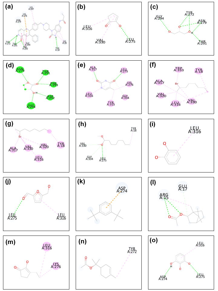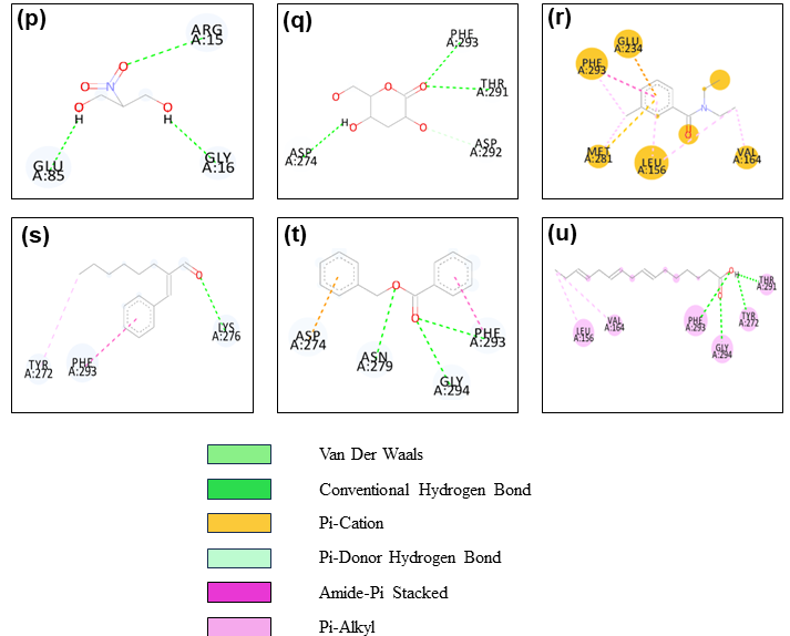 Fig. 4: Visualization 2D interactions borussertib and bioactive compounds from nanoherbal senduduk bulu against the AKT1 protein. (a) borussertib; (b) 2-Cyclopenten-1-one, 2-hydroxy-; (c) Glycerin; (d) 2-Hydroxy-gamma-butyrolactone; (e) Thymine; (f) Octane, 2-bromo-; (g) 4H-Pyran-4-one, 2,3-dihydro-3,5-dihydroxy-6-methyl-; (h) Octanal dimethyl acetal; (i) Catechol; (j) 5-Hydroxymethylfurfural; (k) Benzene, 1,3-bis(1,1-dimethylethyl)-; (l) Isobornyl acetate; (m) 2-Cyclopenten-1-one, 3-ethyl-2-hydroxy-; (n) α-Terpinyl acetate; (o) 1,2,3-Benzenetriol; (p) 1,3-Propanediol, 2-(hydroxymethyl)-2-nitro-; (q) 3-Deoxy-d-mannoic lactone; (r) Diethyltoluamide; (s) Octanal, 2-(phenylmethylene)-; (t) Benzyl Benzoate; (u) 7,10,13-Hexadecatrienoic acid