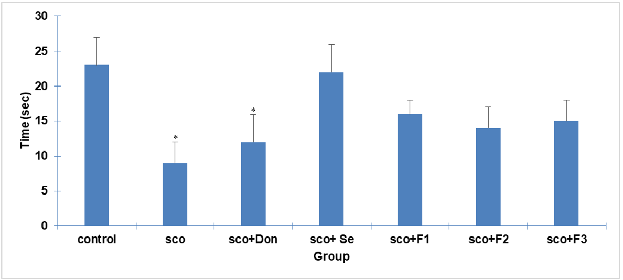 SCO+F2: Group receiving scopolamine (5 mg/kg) with loaded SeNPs with chitosan coating (containing 0.1 mg/kg donepezil).