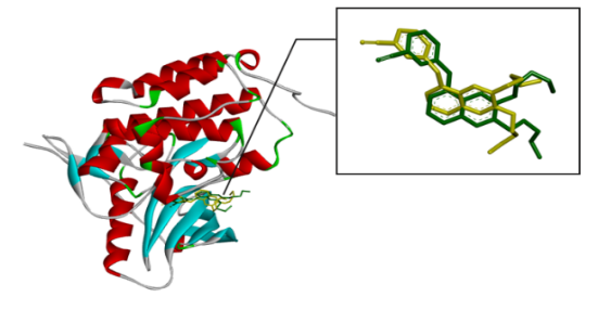 Fig. 1: Superimposed re-docking ligand (green) into native ligand (yellow) of protein receptor: the complex of EFGR (ID PDB: 1m17) – AQ4