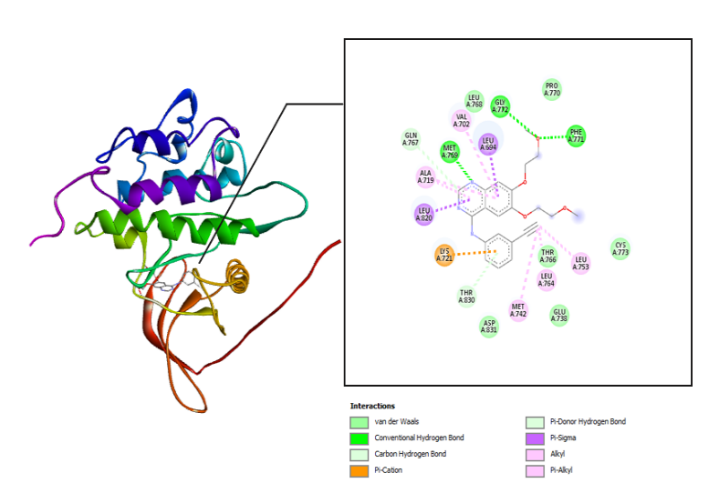 | Erlotinib (native ligand) | MET769, GLY772, PHEA771 | THR766, LEU694, LEU820, VAL702, GLIN767, ALA719, LYS721, THR830, MET742, LEU753 |