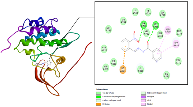 | 2-nitrobenzylidene benzohydrazide (L3) | MET769, THR766 | LYS721, ALA719, LEU694 |