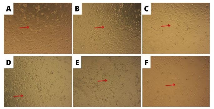 Fig. 5: Morphology of cancer stem cells treated with test compounds with incubation for 24 h with 10x magnification (A) control cells (B) benzylidene benzo hydrazide (C) 2-methyl benzylidene benzohydrazide (D) 2-bromobenzylidene benzo hydrazide (E) 2-nitro benzylidene benzohydrazide (F) doxorubicin