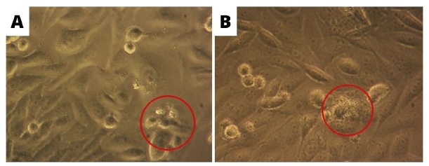 Fig. 6: Cancer Stem Cells that morphological changes after being treated with the test compound were observed with an inverted microscope at 40x magnification (A) apoptosis (B) necrosis