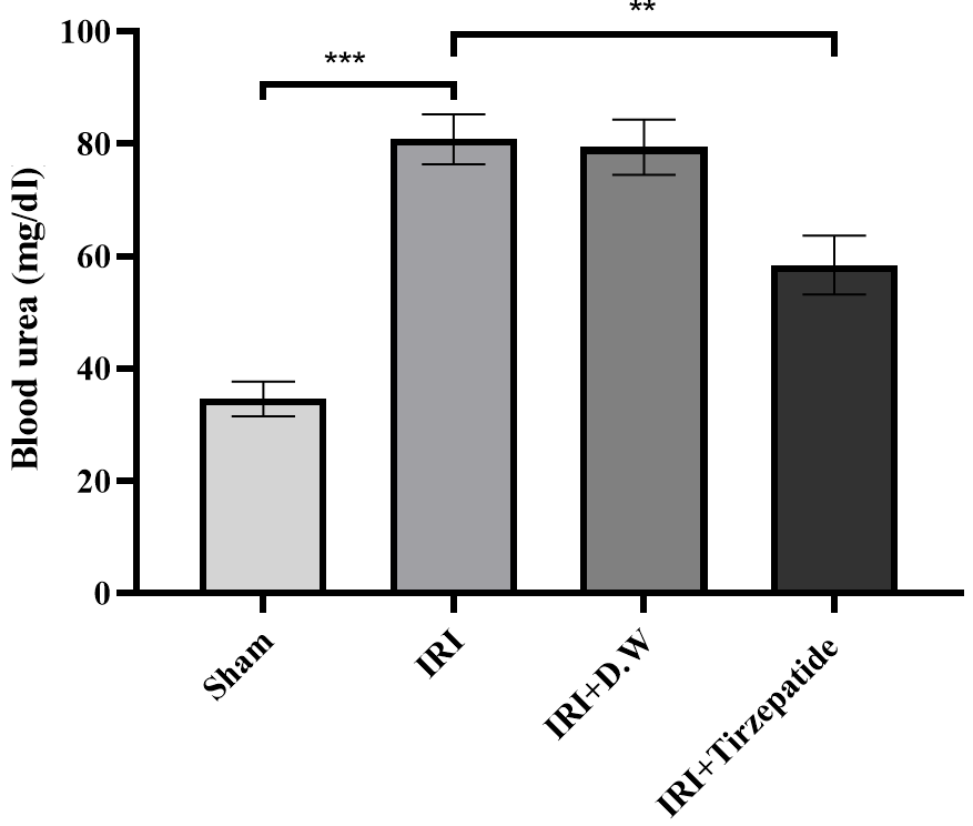 Fig. 1 After 30 min of ischemia, rats were reperfused for 24 h. They were pretreated 2h before ischemia with either a vehicle D. W, tirzepatide (3 mg/kg), or left untreated (sham and IRI group). Serum urea concentrations were assessed utilizing the spectrophotometric technique. Following one-way ANOVA, data were analyzed using Bonferroni multiple comparison test. Data were represented as mean±SEM, n = 7 rats per group; **P<0.01, ***P<0.001.