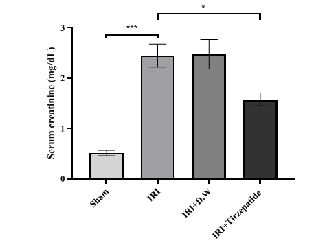 Fig. 2 After 30 min of ischemia, rats were reperfused for 24 h. They were pretreated 2h before ischemia with either a vehicle D. W, tirzepatide (3 mg/kg), or left untreated (sham and IRI group). Serum creatinine concentrations were assessed utilizing the spectrophotometric technique. Following one-way ANOVA, the data were analyzed using Bonferroni multiple comparison test. Data were represented as mean±SEM, n = 7 rats per group; *P<0.05, ***P<0.001.