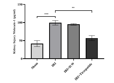 Fig. 3 After 30 min of ischemia, rats were reperfused for 24 h. They were pretreated 2 h before ischemia with either a vehicle D. W, tirzepatide (3 mg/kg), or left untreated (sham and IRI group). Renal KIM-1 concentrations were assessed utilizing ELISA kit. Following one-way ANOVA, the data were analyzed using Bonferroni multiple comparison test. Data were represented as mean±SEM, n = 7 rats per group; **P<0.01, ***P<0.001.